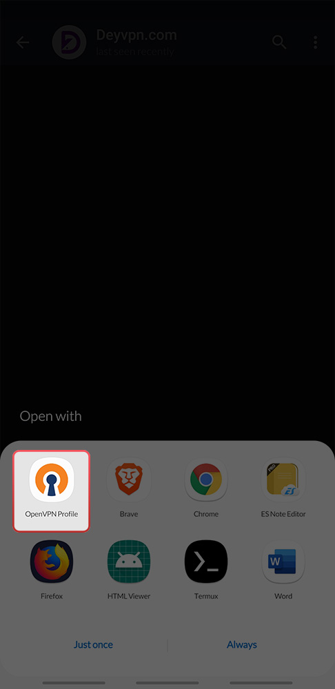 3 سپس یکی از پروفایلهای OPENVPN را دانلود و باز کنید، با باز کردن پروفایل با صفحه مانند شکل زیر روبرو خواهید شد که باید برنامه OpenVPN را انتخاب کنید تا پروفایل مربوطه با برنامه اپن وی پی ان باز شود.
