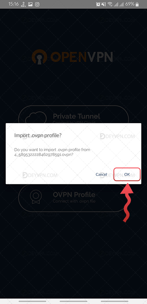 2 توجه اما اگر پروفایل رو از قسمت پشتیبانی در تلگرام دریافت می کنید می توانید در همان تلگرام پروفایل را دانلود و داخل تلگرام Import کنید به Openvpn